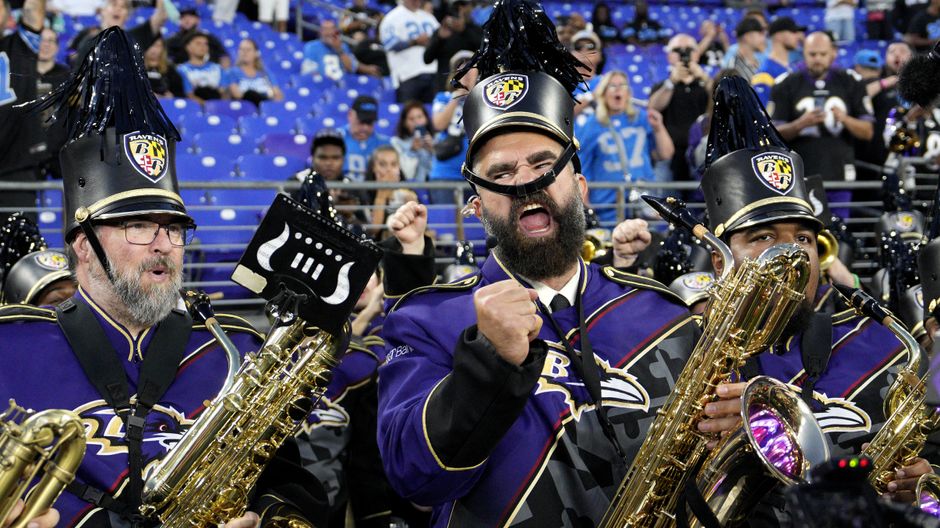 Jason Kelce überrascht an der NFL-Seitenlinie mit einem Auftritt in der Blaskapelle der Baltimore Ravens. Der Experte begeistert am Saxophon.
